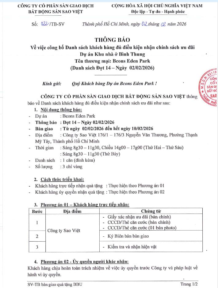 022.TB-SV 2026 TB danh sách khách hàng đủ điều kiện nhận ưu đãi DA Bcons Eden Park Đợt 14 – Ngày 02.02.2026