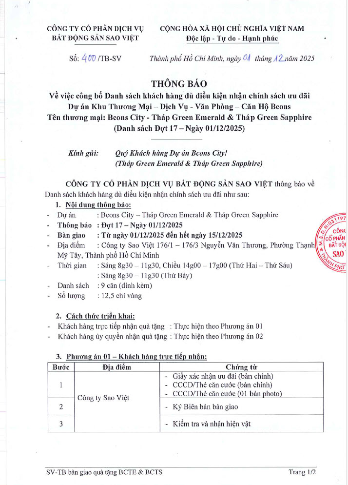 Thông báo 400/TB-SV: v/v danh sách khách hàng đủ điều kiện nhận chính sách ưu đãi dự án Emerald & Sapphire đợt 17