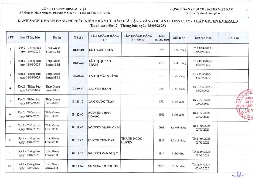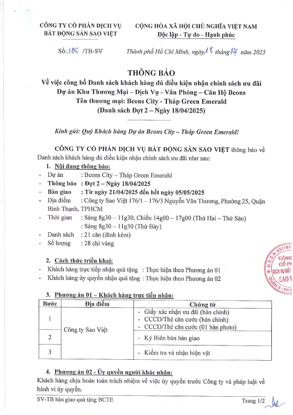 CÔNG TY CỔ PHẦN DỊCH VỤ BẤT ĐỘNG SẢN SAO VIỆT thông báo về danh sách khách hàng đủ điều kiện chính sách ưu đãi dự án Khu Thương Mại – Dịch Vụ – Văn Phòng – Căn Hộ Bcons